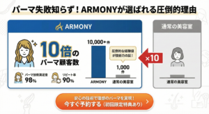 全国のパーマ比率は約6%ですがARMONYでは約70%のパーマ比率があり全国でもトップクラスの経験があるスタイリスト達になります。
